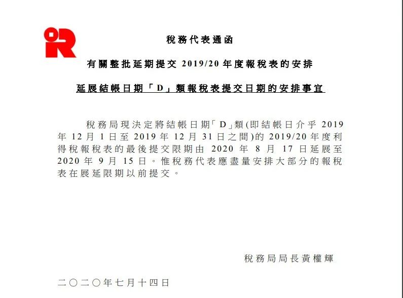 公告 | 香港稅局:利得稅表提交期限可延期至9月15日!