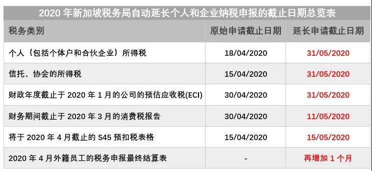 2020年4月4日,新加坡稅務(wù)局(IRAS)根據(jù)COVID-19情況的最新措施,作為對納稅人的支持,新加坡稅務(wù)局(IRAS)自動延長個(gè)人和企業(yè)納稅申報(bào)的截止日期如下:
